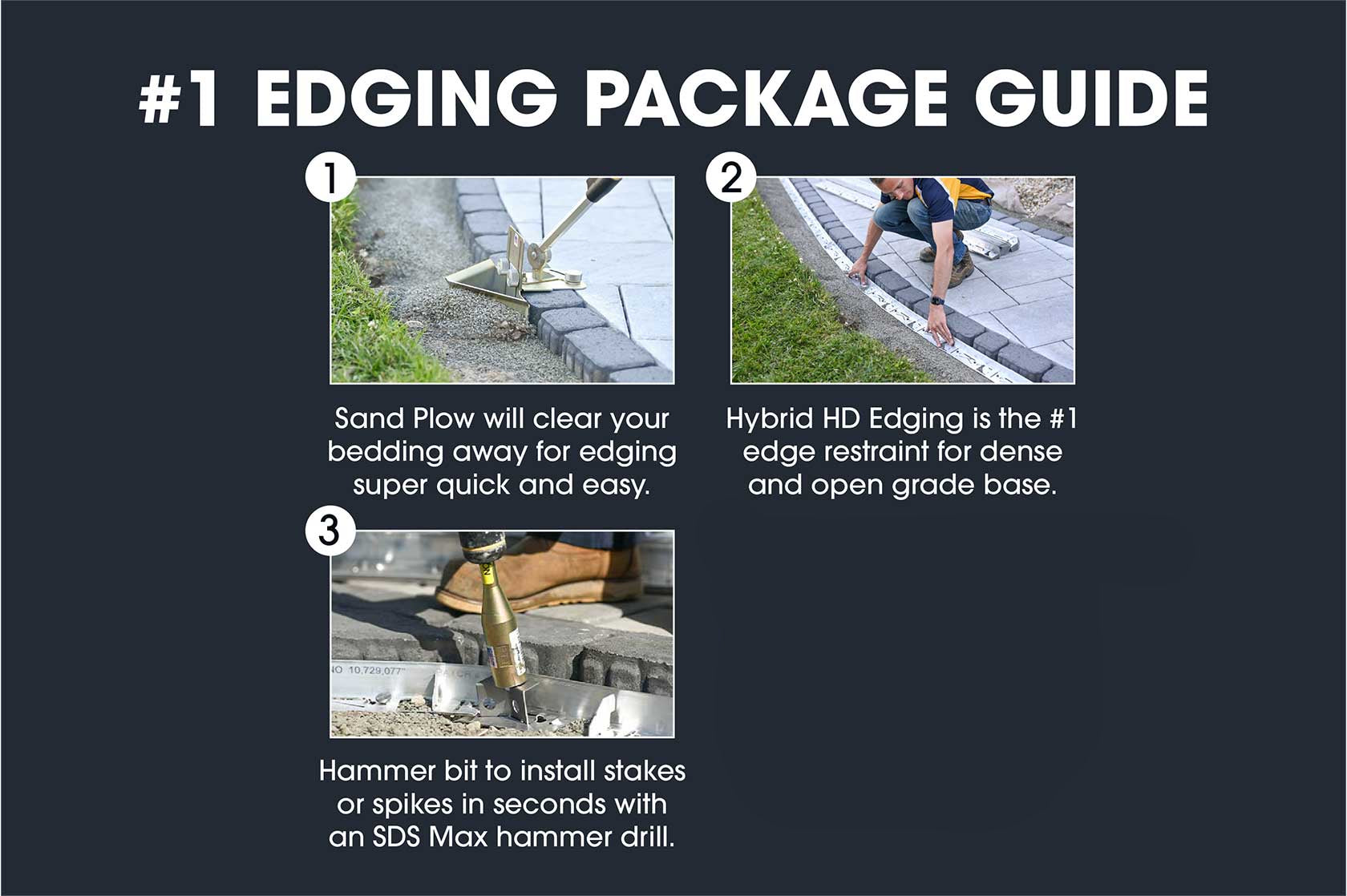 This package is built to help hardscapers install the best edge restraint on the market easily and efficiently. From base prep to hammering the spikes/stakes, this system saves you time, reduces strain, and improves accuracy on every edge restraint installation.